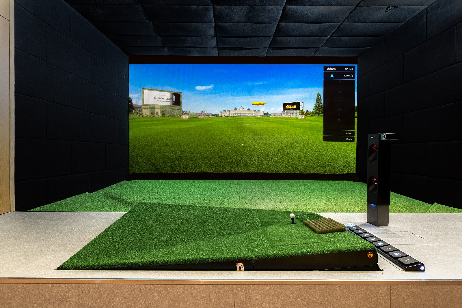 The top-of-the-line Quantum simulator with a 9-axis moving plate (19,000+ lies) runs an ultra-responsive engine with tour-grade ball/club data, realistic short game, AI-coach guidance, and optional Live Play leagues for cross-office engagement.